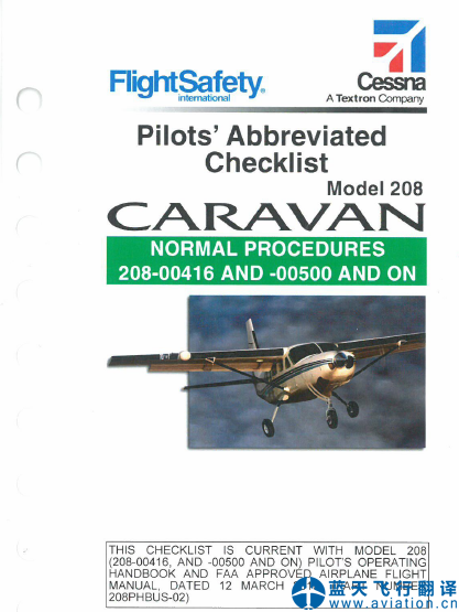 北京藍(lán)天飛行翻譯公司承接大型通航公司的塞斯納208簡(jiǎn)易檢查單翻譯任務(wù),塞斯納208簡(jiǎn)易檢查單包含有正常程序和應(yīng)急/非正常程序,Cessna 208 CARAVAN Pilots’ Abbreviated Checklist Translation