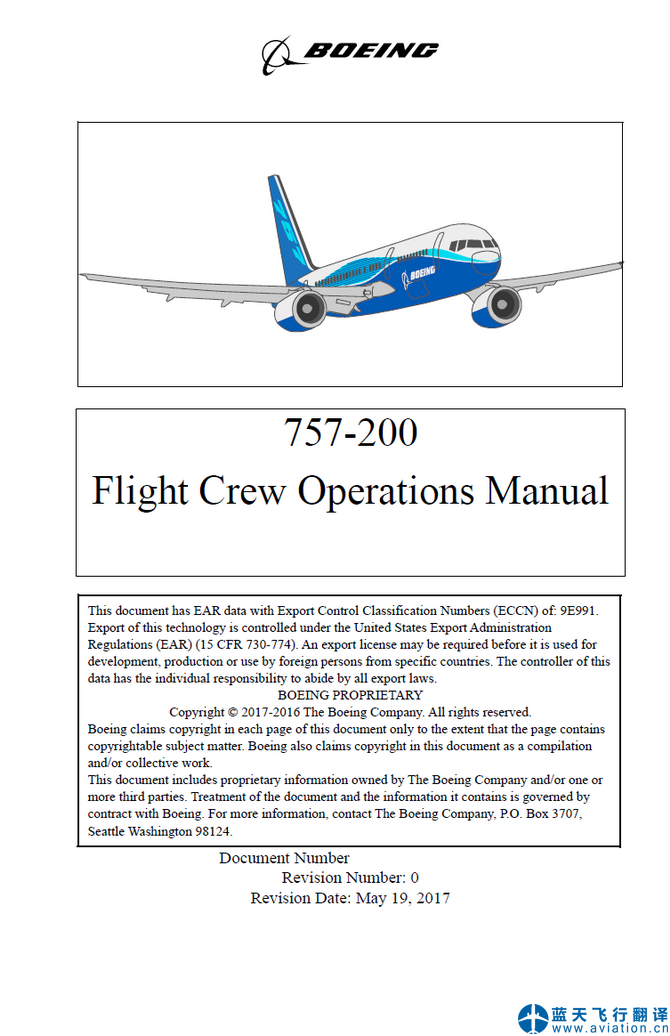 北京藍(lán)天飛行翻譯公司完成大型航空公司2017年5月19日版本波音757機(jī)組使用手冊(cè)和757快速檢查單翻譯 757 Flight Crew Operations Manual and 757 Quick Reference Handbook Translation Revision Date: May 19, 2017 ![]() 757機(jī)組使用手冊(cè) 757 Flight Crew Operations Manual ![]() 757快速檢查單 757 Quick Reference Handbook |
