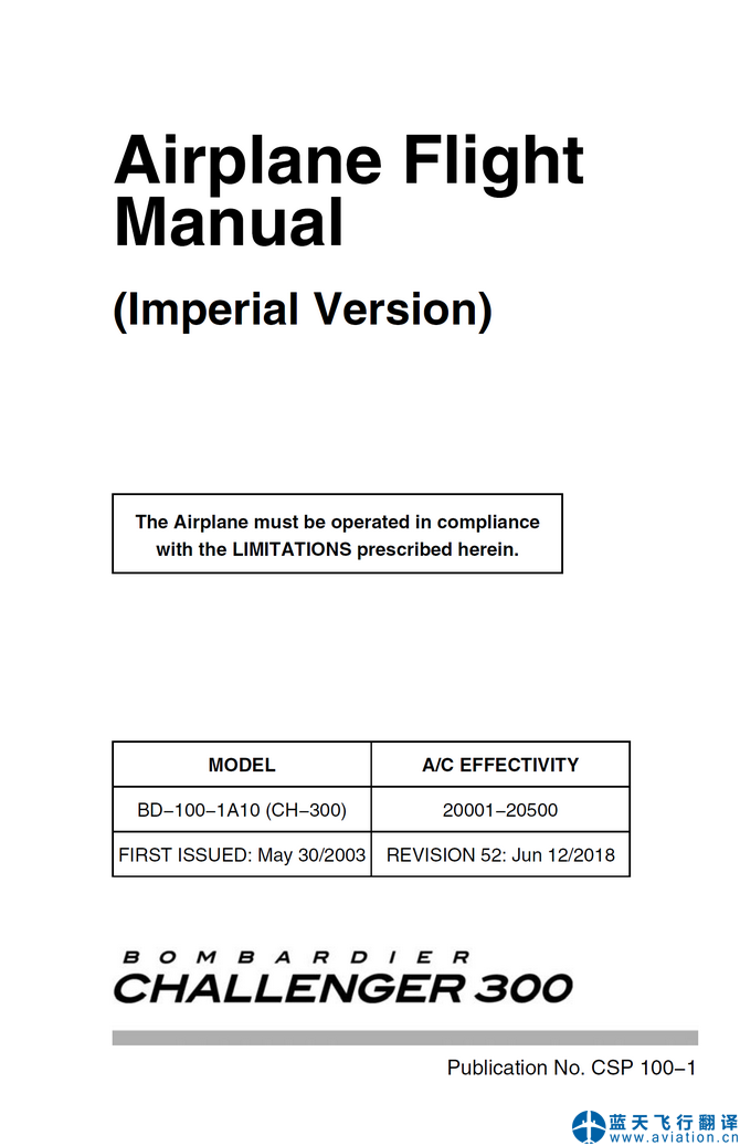 挑戰(zhàn)者300飛機(jī)飛行手冊(cè) Challenger 300 Airplane Flight Manual 版次為2018年6月12日第52版