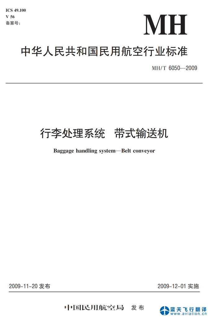 北京藍(lán)天飛行翻譯有限公司承接中華人民共和國(guó)民用航空行業(yè)標(biāo)準(zhǔn)行李處理系統(tǒng)帶式輸送機(jī)翻譯任務(wù) MH/T 6050—2009 行李處理系統(tǒng)帶式輸送機(jī) Baggage Handling System—Belt Conveyor, Civil Aviation Industrial Standard Translation