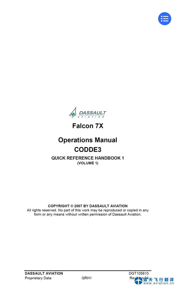 北京藍天飛行翻譯公司完成大型公務機公司的達索獵鷹7X快速檢查單翻譯任務 DASSAULT AVIATION Falcon 7X QUICK REFERENCE HANDBOOK Translation