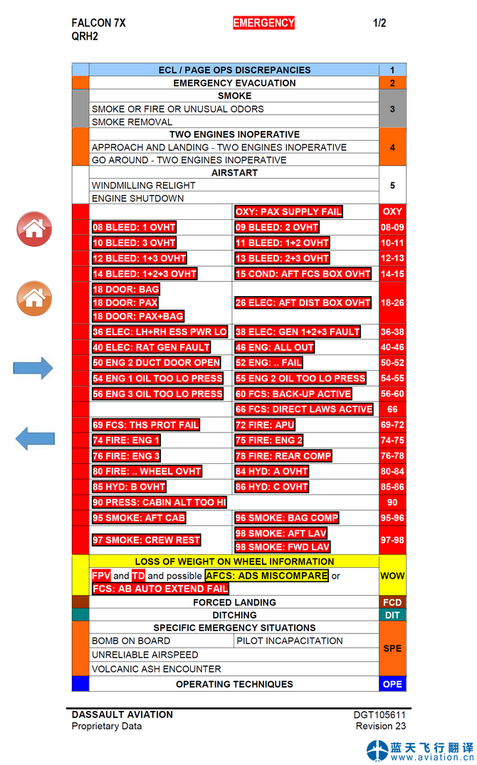 達索獵鷹7X公務機快速檢查單分為兩冊,第一冊為限制、正常程序、特殊程序、性能、飛行計劃等,第二冊為應急程序和非正常程序,本次北京藍天飛行翻譯公司翻譯的達索獵鷹7X快速檢查單第一冊為第24版,版本日期為2020年1月10日,第二冊為第23版,版本日期為2020年1月10日。