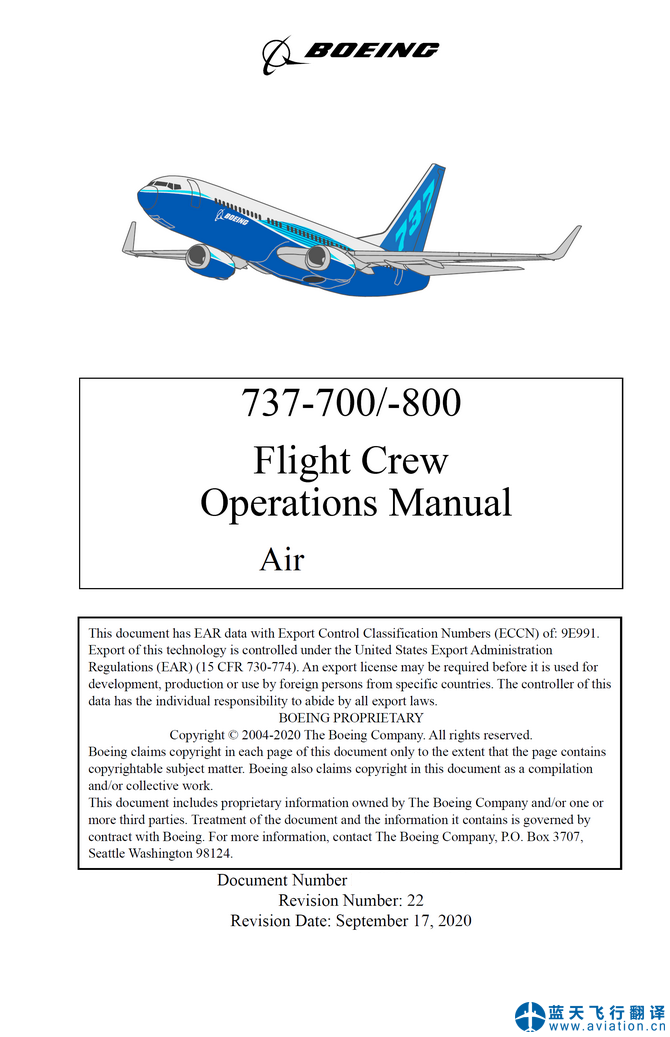 北京藍(lán)天飛行翻譯公司承接航空公司的737-700/-800飛行機(jī)組使用手冊(cè)、快速檢查單和飛機(jī)飛行手冊(cè)翻譯任務(wù) 737-700/-800 Flight Crew Operations Manual, Quick Reference Handbook and Airplane Flight Manual Translation