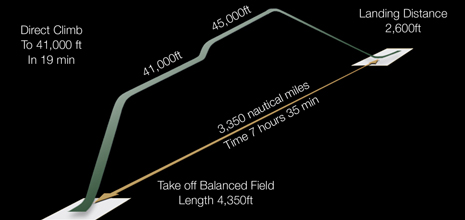 Performance 性能 Falcon performance 獵鷹性能 機(jī)會(huì)就在眼前。2000S有直飛3,350海里無(wú)需加油的續(xù)航能力, 有無(wú)與倫比的飛行速度和靈活性,以及舒適寬大的客艙,其誘人的魅力無(wú)法阻擋。 Go direct 直飛 With its certified altitude of 47,000 ft and its power to climb directly to 41,000 ft, the Falcon 2000S takes you above most traffic and weather. And it can fly 3,350 nm nonstop. Due to its excellent short field capabilities, you can take off and land at smaller, more convenient airports. 獵鷹2000S具有47,000英尺的最大認(rèn)證高度,直接爬升41,000英尺,不費(fèi)吹灰之力。獵鷹2000S能帶領(lǐng)乘客穿云破霧,突破各種航行和氣候條件限制,即使連續(xù)飛行3,350海里也無(wú)需?。加上完美的小場(chǎng)地操控性能,可更好地起飛降落各類機(jī)場(chǎng),為您提供更多便捷服務(wù)。 ![]() 達(dá)索獵鷹2000S公務(wù)機(jī)直飛 Expanding your horizons 擴(kuò)大您的視野 從北京到新加坡,從香港到孟買,從成都到雅加達(dá)無(wú)須中途?。即使穿越亞洲直到歐洲的飛行任務(wù),也僅需?恳淮尉湍軋A滿完成。獵鷹2000S本身就是一個(gè)經(jīng)典杰作。 BFL at MTOW: SL - ISA 4,325 ft 1,318 m