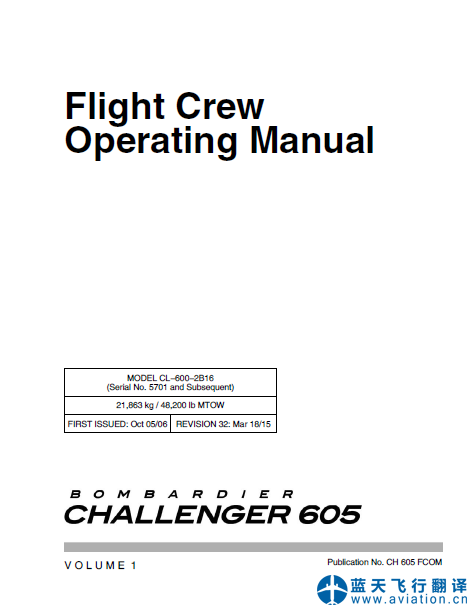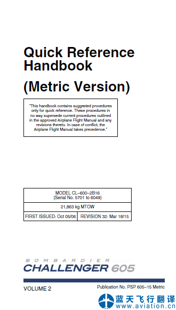 北京藍(lán)天飛行翻譯公司完成大型公務(wù)機(jī)公司的第32版/2015年3月18日版本龐巴迪挑戰(zhàn)者605全套飛行手冊翻譯任務(wù):第32版龐巴迪挑戰(zhàn)者605飛機(jī)飛行手冊、機(jī)組操作手冊、快速檢查單 Revision 32 Mar 18/15 Bombardier Challenger 605 Airplane Flight Manual, Flight Crew Operating Manual, Quick Reference Handbook Translation ![]() 龐巴迪挑戰(zhàn)者605飛機(jī)飛行手冊 Bombardier Challenger 605 Airplane Flight Manual ![]() 龐巴迪挑戰(zhàn)者605機(jī)組操作手冊第一冊 Bombardier Challenger 605 Flight Crew Operating Manual ![]() 龐巴迪挑戰(zhàn)者605機(jī)組操作手冊 Bombardier Challenger 605 Flight Crew Operating Manual ![]() 龐巴迪挑戰(zhàn)者605快速檢查單第一冊 Bombardier Challenger 605 Quick Reference Handbook ![]() 龐巴迪挑戰(zhàn)者605快速檢查單第二冊 Bombardier Challenger 605 Quick Reference Handbook |