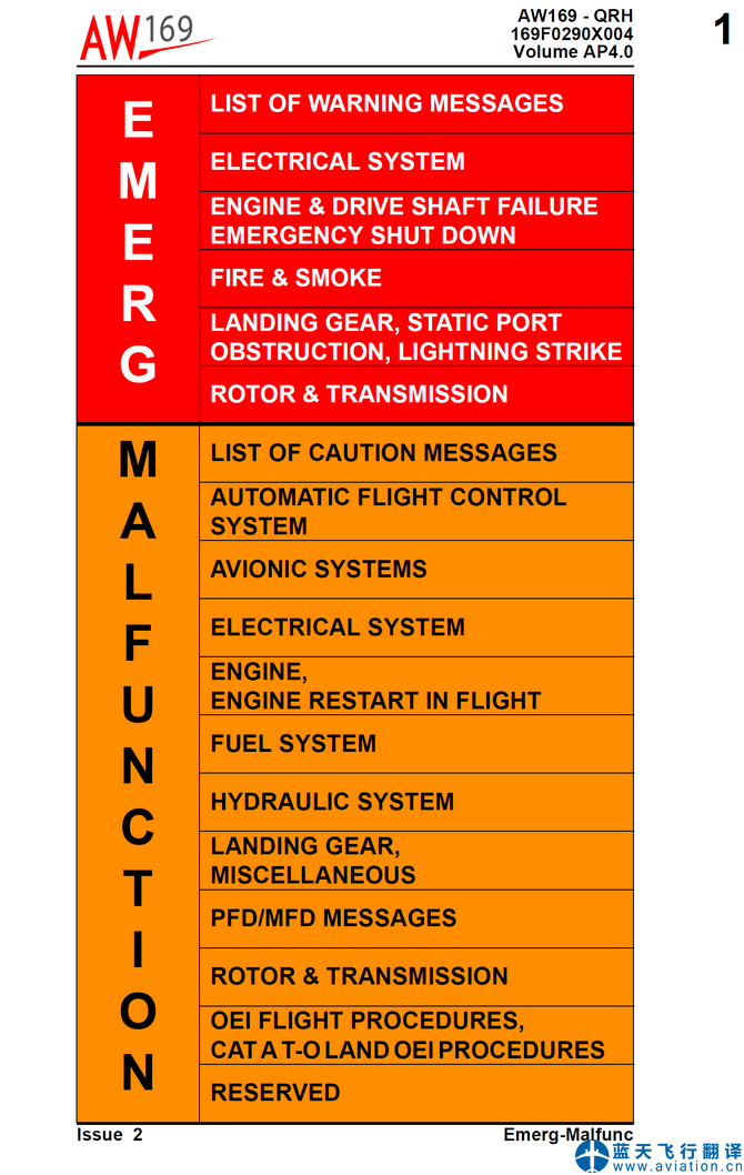 AW169直升機快速檢查單(Quick Reference Handbook(QRH))的主要內容包含有: