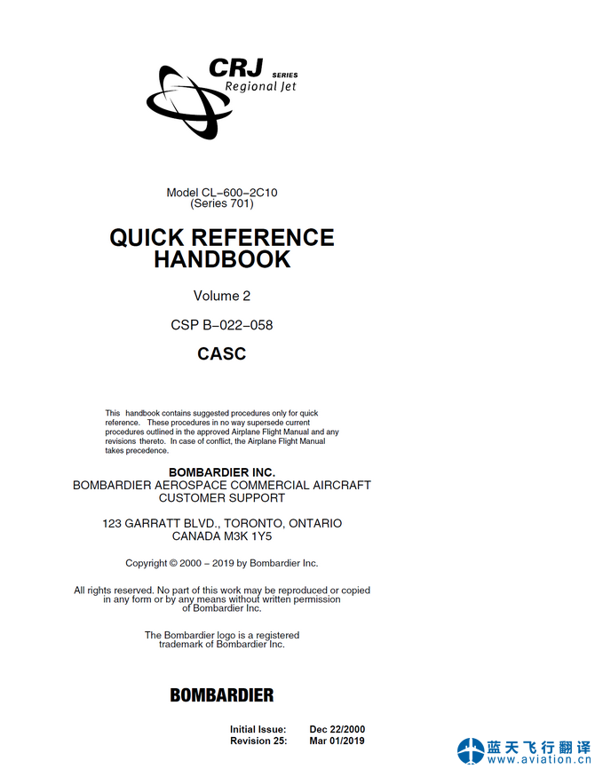本次翻譯的CRJ700快速檢查單為第25版,2019年3月1日版本,分為上下兩冊。Model CL−600−2C10