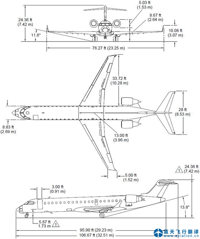 ![]() CRJ700飛機尺寸 ![]() CRJ700 快速檢查單 CRJ700 QUICK REFERENCE HANDBOOK ![]() CRJ700 快速檢查單 CRJ700 QUICK REFERENCE HANDBOOK CRJ700飛機是CRJ200飛機的加長型,兩者在機體結(jié)構(gòu)和操縱使用方面具有很高的通用性。與CRJ200相比,CRJ700的主要特點是:通過在CRJ200中機身的前、后方加入艙段,增大了 機身和客艙長度;通過在機翼根部增加插入段,增大了翼展;換裝了推力更大的新型發(fā)動機;每客千米的直接使用成本降低了20%。該機的維修間隔時間設(shè)計為A檢400h,C檢4000h。采用帶有翼翹的后掠式下單翼;后部機身靠上安裝兩臺通用電氣CF34渦輪風(fēng)扇發(fā)動機;具有后掠式T型垂直尾翼和水平尾翼。其機翼前緣前伸,并加裝了前緣縫翼。主起落架結(jié)構(gòu)也進行了加強,采用新的輪胎和剎車系統(tǒng),設(shè)計壽命提高。 除特別指明外,以下描述均針對CRJ701與CRJ200的不同之處。 機身 前機身加長3.96m,后機身加長0.76m。 機翼 翼展增加1.83m。機翼前緣前伸,并加裝了前緣縫翼。 尾翼 尾翼增大了平尾面積。 起落架 液壓收放的前三點起落架,均為雙輪,由美國古德里奇公司提供。設(shè)計壽命提高到80000次起降。主起落架支柱延長,采用新的機輪、輪胎和剎車裝置,其中輪胎壽命提高到250~400次著陸 ,剎車片壽命提高到1600次著陸剎車。主輪輪胎規(guī)格36×12.0-18,胎壓10.55×105Pa。前輪輪胎規(guī)格20.5×6.75-10,胎壓9.24×105Pa。動力裝置 2臺尾吊安裝的CF34-8C1渦扇發(fā)動機,單臺額定推力為56.4kN(不包括自動功率儲備)或61.3kN(包括自動功率儲備),可在氣溫30。C,其他條件符合國際標準大氣的情況下保持推力。CRJ705換裝了CF34-8C5渦扇發(fā)動機,單臺額定推力為58.4kN(不包括自動功率儲備)或64.5kN(包括自動功率儲備)。CRJ705還可選裝CF34-8C5A1渦扇發(fā)動機。有反推力裝置。全權(quán)數(shù)字電子控制。機內(nèi)總?cè)加腿萘繛?0989L,有壓力和重力加油口。[5] 駕駛艙與客艙 全增壓機艙,雙人制駕駛艙?团摌藴什季譃70座,每排4座并有中央通道,排距79cm,中央通道寬41cm,高1.89m。客艙地板降低2.5cm,頂板抬高1.3cm,舷窗位置抬高11.5cm。衣櫥、廚房和盥洗室有多種組合方式,具體取決于客艙布局。重新設(shè)計了頭頂行李柜,并在客艙前部地板下方左側(cè)新設(shè)1個容 積為3.08m3的行李艙,全機行李艙容積增加了近10m3。CRJ705的客 艙標準布局為75座,每排4座并有中央通道,爵士航空公司訂購的飛機采用兩級布局,即公務(wù)艙10座、排距94cm和經(jīng)濟艙65座、排距87cm。