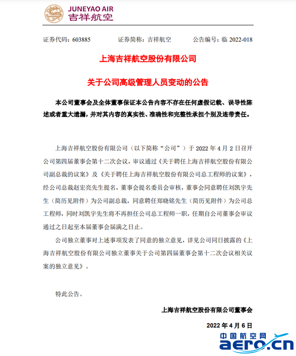 吉祥航空:聘任劉凱宇為公司副總裁,聘任鄭曉銘為公司總工程師